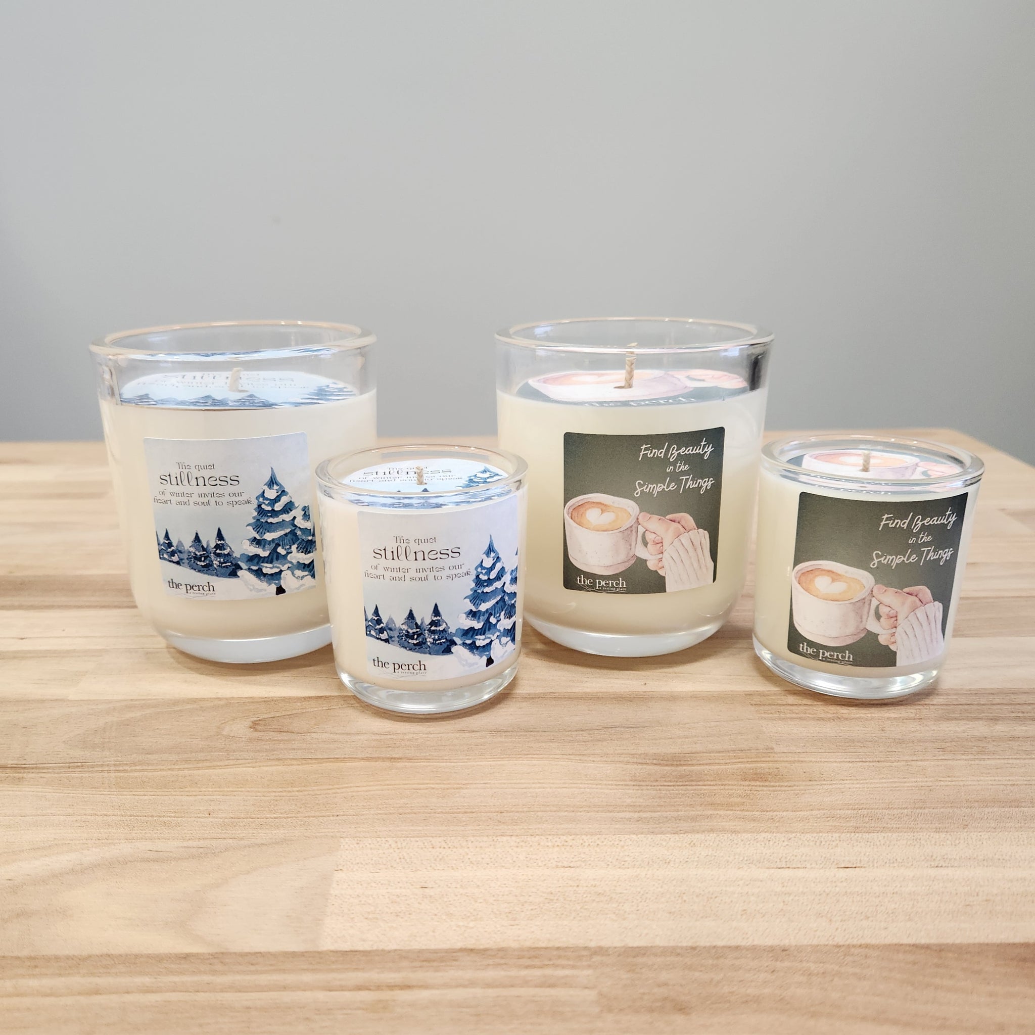 Choose from 3.5 oz (25 hour burn time) or 10 oz (70 hour burn time). They are poured into thick glass tumblers that can be reused after your candle is used up. They come with a dust cover rather than a lid.